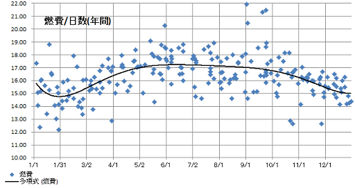 で、上の数値を月日で、循環関数にはしていないが、多項式でならすとこんな感じ。