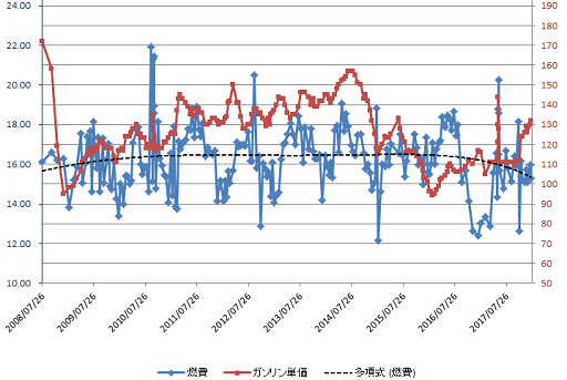 10年間の軽自動車の燃費とガソリン単価。224回分
