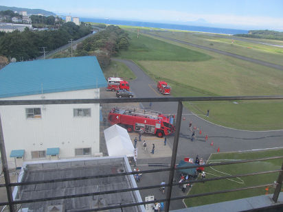 奥には富士山。下の方は放水訓練。