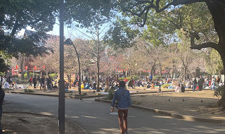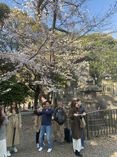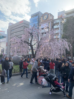 彰義隊の墓。満開状態の桜の周りには、地鶏ならぬ、自撮りがたくさん。