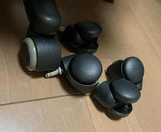 今までの、ビジネスカーペット用を外して、フローリング用ウレタン製キャスターに変更