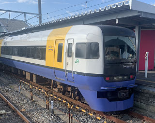 で、向こうのプラットホームにいたのが、佐倉経由して、東京まで行くらしい房総ビューエクスプレスと英語で書かれてた。特急しおさいですね。
