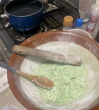 餅粉をダイソーで買って、お湯で練って、砂糖も一寸入れてヨモギと一緒。