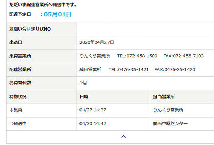 で、そこから4日目の5月1日に届きました。