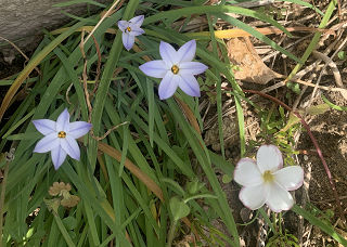 青い方は、ハナニラ。庭のあちこち咲いてる。