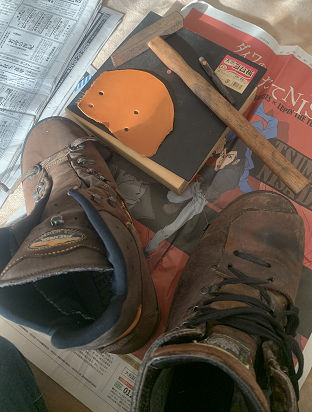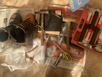昨年買って置いた神田あたりだっけ?登山用品店の靴とジョイ本の200円端材革。