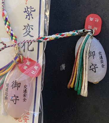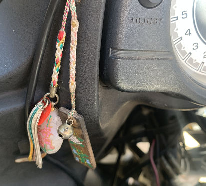 バイクにつけてる 紫外線感知の御守りがヒビだらけで色も出にくくなったので交換。