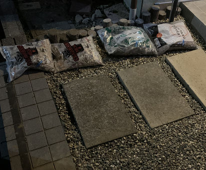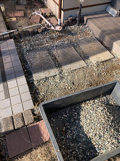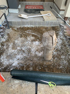 玄関の雑草対策。砂利を除けて、石灰と土を混ぜて一個だけ残した切り株を槌代わりに地面を固める。