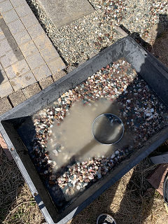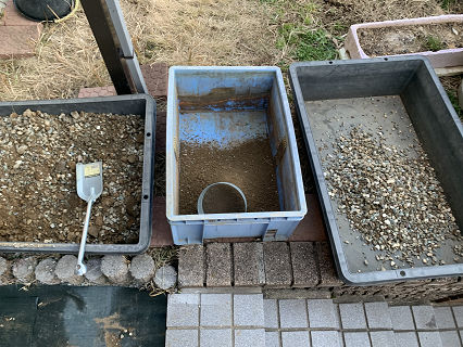 砂利を篩にかけて、水淡いしてから、水切りかねて再び篩い。
