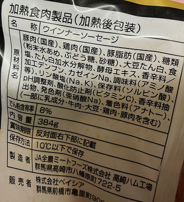 鶏肉、豚脂肪の順で始まる物よりは、味も変化なく美味しいのだが、100g100円超えたので普通に肉を買おうと思う。