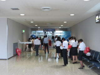 国内線降り場の端っこで、人混みが、アメリカンエアーとの共同運行のセレモニーの準備をしていたようです。