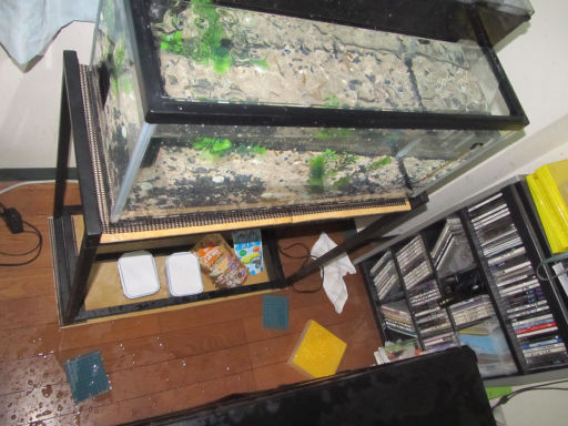 30分以上かかって、水槽の水を抜いて床を拭いて