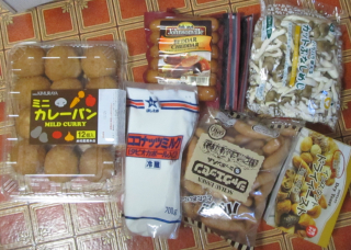 3600円なり。ソーセージ2種にドライイースト、シメジ。ココナッツミルクにカレーパン。うーん、安かったけど微妙。