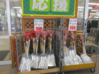 ちなみに、通常のスコップ売り場。東日本の震災の食料売り場のようです。