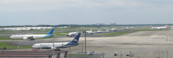 うーんとね。左側に滑走路があって、飛行機が並んでいるのが誘導路。