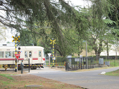 敷地内を走る電車。隊舎との間には専用の踏切があります。