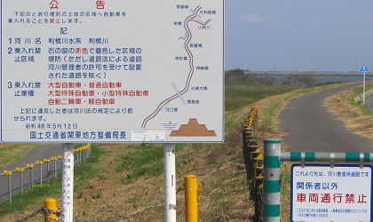 上の画像は、初めてわかった土手の走行制限。バイクはだめだけど、125cc以下の原付は