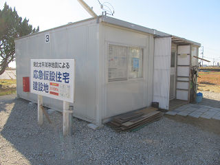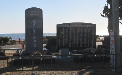 山中食品前の仮設住宅の保存。 飯岡荘の前の祈念碑。津波の高さが上の方に横線で引かれています。